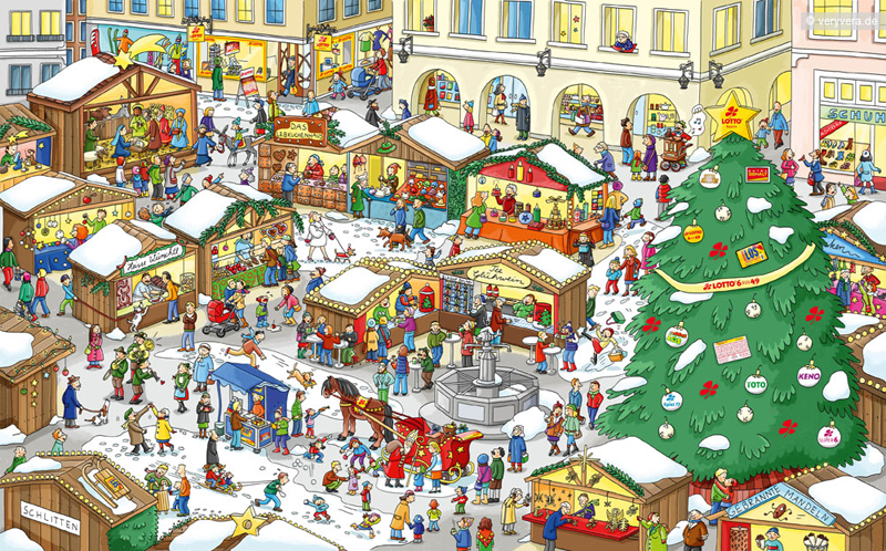 Huch, es ist ja schon der fünfte Dezember! Na dann mal schnell ein paar Türchen meines Adventskalenders öffnen! Ab heute gibt es bis zum 24. Dezember jeden Tag einen kleinen Ausschnitt meines Wimmelbildes, dass ich im Juli für Lotto Bayern (Agentur Serviceplan) gezeichnet habe. (Ich gebe zu, dass es ganz schön hart war an Schnee und Lebkuchen zu denken, während draussen die Sonne tobte...).